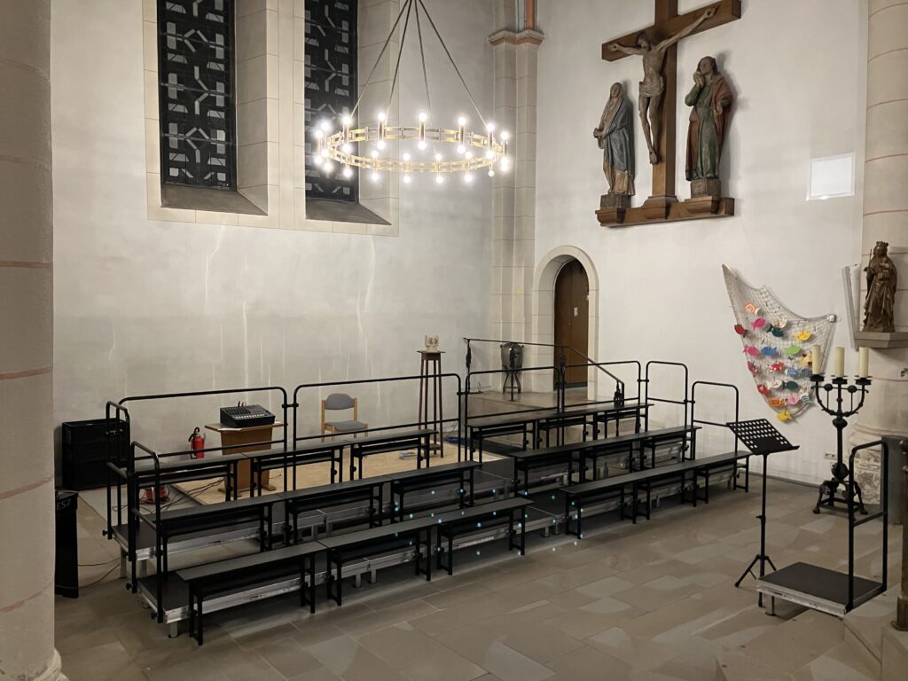Der Kirchenchor wird künftig seinen Platz im nördlichen Querhaus vor der neuen Hauptorgel haben. Damit die Sängerinnen und Sänger dort gut stehen und auch zwischendurch sitzen können – was im Übrigen auf der „alten“ Orgelempore nur sehr bedingt möglich war –, hat der Kirchenvorstand die Beschaffung von neuen Chorpodesten beschlossen. Diese wurden bei der Firma Podestbau Kleu GmbH aus Wuppertal gekauft. Dank der sehr guten Beratung durch Herrn David Kanzler von der Firma Kleu konnte eine maßgeschneiderte Lösung gefunden werden.