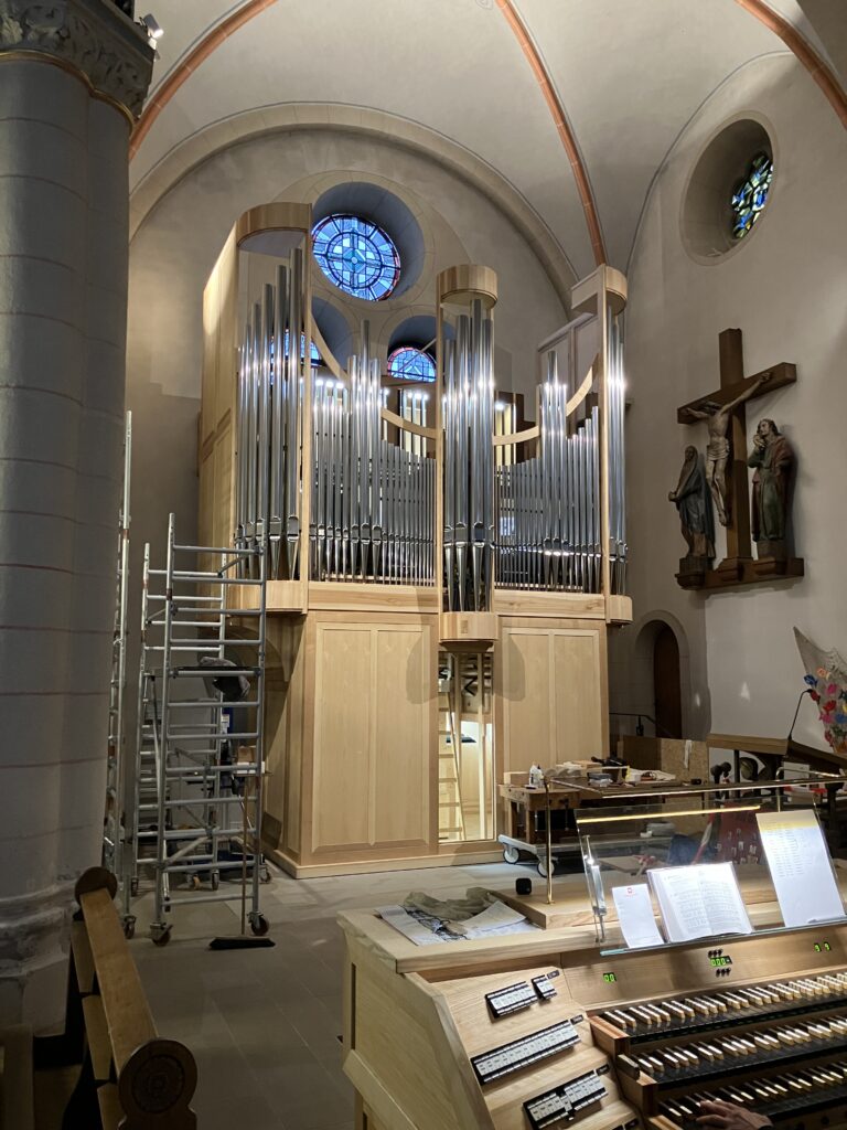 Die Prospektpfeifen (Prinzipal 8‘, Oktavbass 8‘) sind eingebaut, die Pfeifen zahlreicher Register stehen auf den Windladen und sind intoniert. Im Wesentlichen fehlen noch die Aliquotregister, die Mixturen, die Trompete und die beiden Oboen (Hauptorgel, Solowerk).