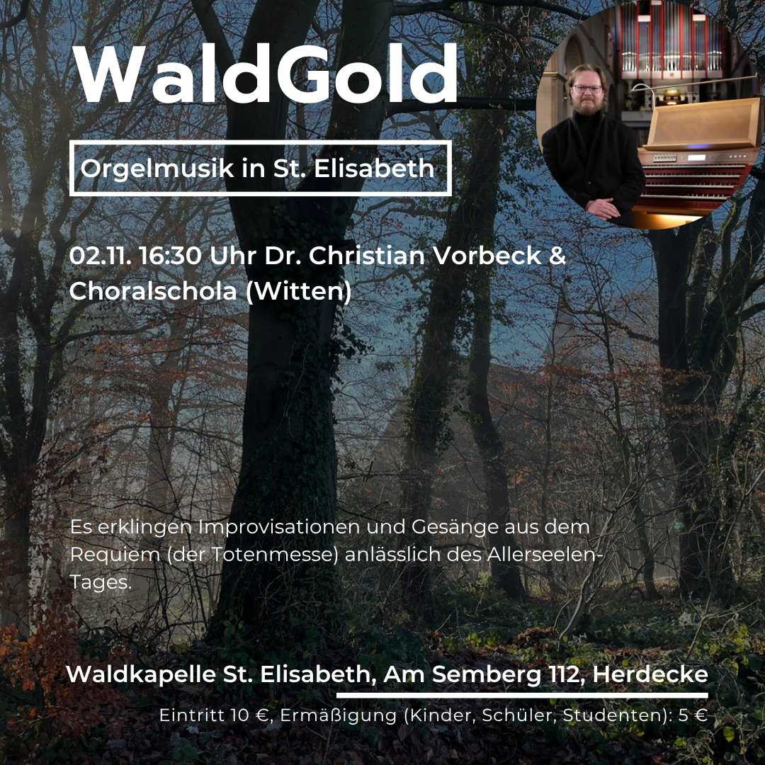 Unter dem Titel „WaldGold goes Allerseelen“ laden die Organisatoren am Sonntag, den 2. November 2025 um 16:30 Uhr in der idyllisch gelegenen Waldkapelle St. Elisabeth in Herdecke zu einem besonderen Erlebnis: Mit Dekanatskirchenmusiker Dr. Christian Vorbeck und der Choralschola Witten wird ein Programm präsentiert, das dem Gedenktag Allerseelen (2. November) gewidmet ist und die Gesänge des lateinischen Requiems in den Mittelpunkt stellt.