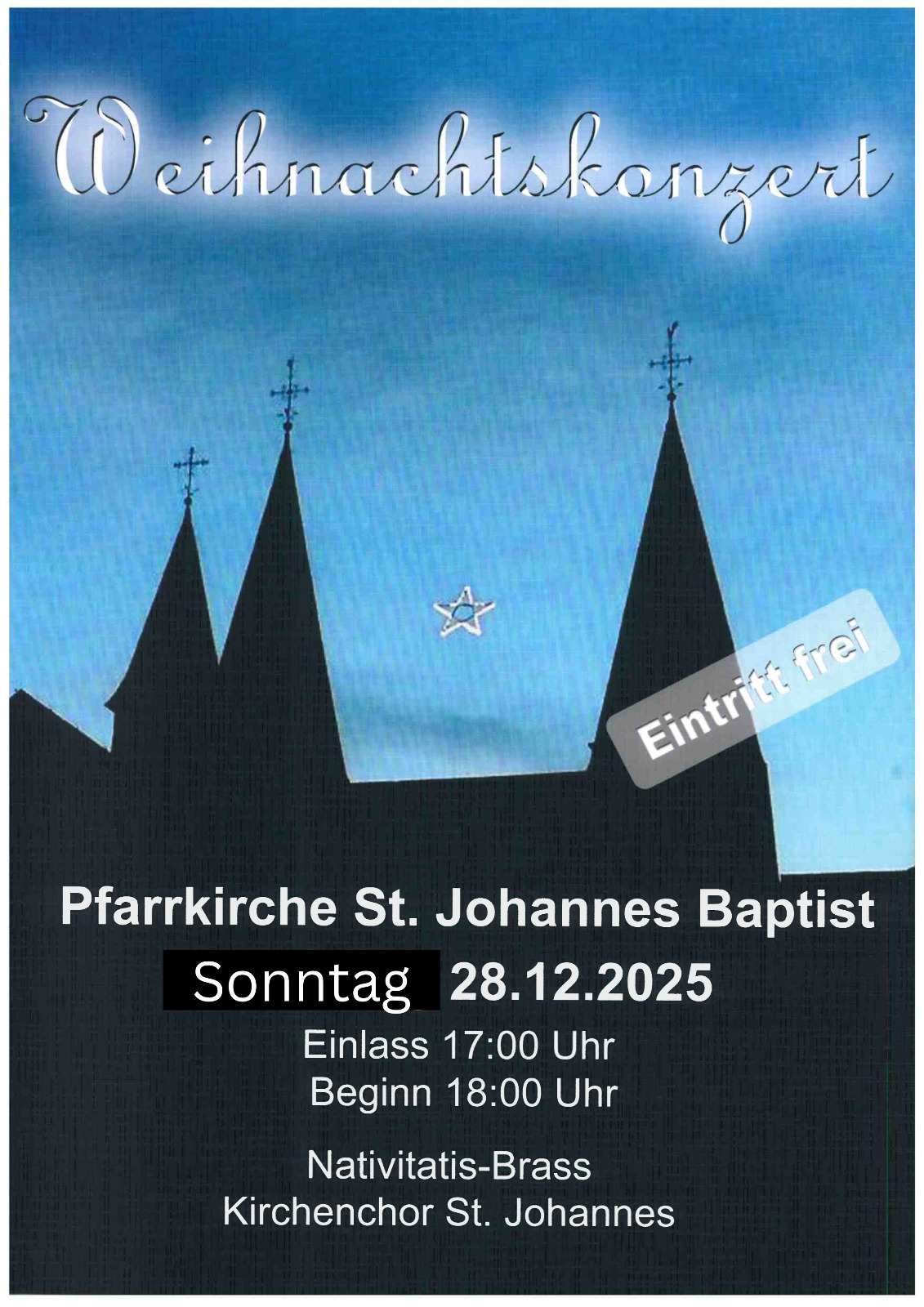 Am Sonntag, dem 28.12.2025, findet um 18 Uhr das traditionelle Weihnachtskonzert statt. Es musizieren Nativitatis Brass und der Kirchenchor St. Johannes.
