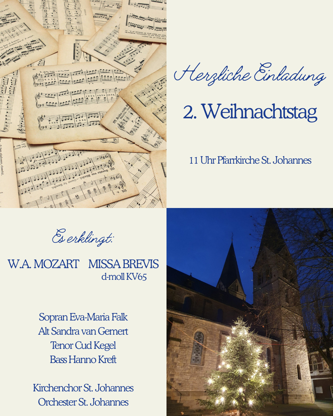 Am zweiten Weihnachtstag, dem 26.12.2025, singt der Kirchenchor St. Johannes Baptist in der Hl. Messe um 11 Uhr die Missa brevis in d-moll, KV 65 für Soli, Chor und Orchester von Wolfgang Amadeus Mozart und weihnachtliche Chorsätze