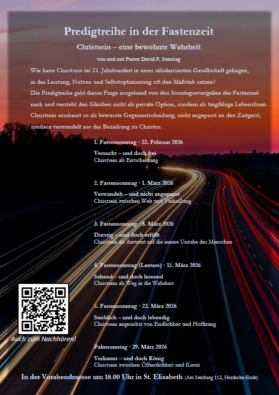 Die Predigtreihe in der Fastenzeit geht dieser Frage entlang der Sonntagsevangelien nach. Sie versteht den Glauben nicht als private Option, sondern als tragfähige Lebensform. Christsein erscheint als bewusste Gegenentscheidung: nicht angepasst an den Zeitgeist, sondern verwandelt aus der lebendigen Beziehung zu Christus.