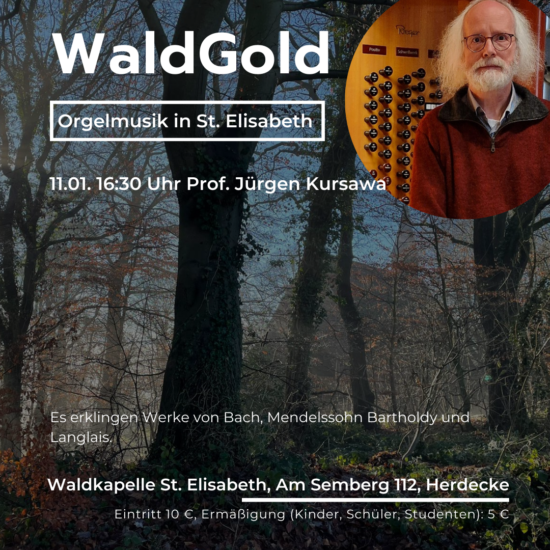 Mit einem hochkarätigen Orgelkonzert eröffnet die Reihe WaldGold – Konzerte in der Waldkapelle St. Elisabeth das musikalische Jahr 2026. Am Sonntag, 11. Januar 2026, um 16:30 Uhr, ist der international renommierte Organist Prof. Jürgen Kursawa aus Düsseldorf in der Waldkapelle zu Gast und präsentiert ein anspruchsvolles und facettenreiches Orgelprogramm.